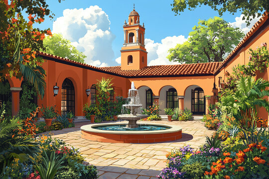 Illustration of a Mexican hacienda with a courtyard and fountain.