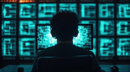 Mysterious figure shrouded in darkness surrounded by streams of binary code at an unknown location