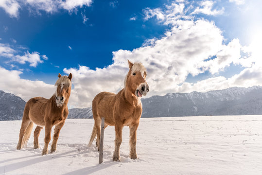 Two Haflinger horses on the winter meadow and mountain peaks on background.
