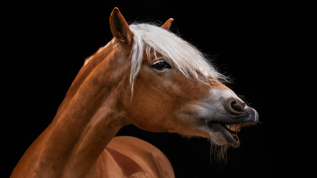 Pferd  Pony lustig flehmender Haflinger vor schwarzem Hintergrund freigestellt