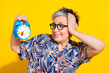 Photo portrait of nice pensioner female look worried alarm clock wear trendy colorful outfit isolated on yellow color background