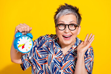 Photo portrait of lovely senior lady hold amazed alarm clock dressed stylish colorful garment isolated on yellow color background