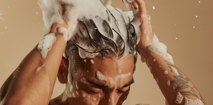 Close-up of a man lathering his hair with shampoo creating thick foam ideal for hair care product advertisements and tutorials