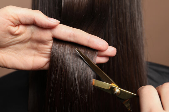 logo collection A beautiful woman having her hair cut by hairdresser scissors.
