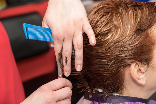A hairdresser cutting hair of a woman. Selective focus.