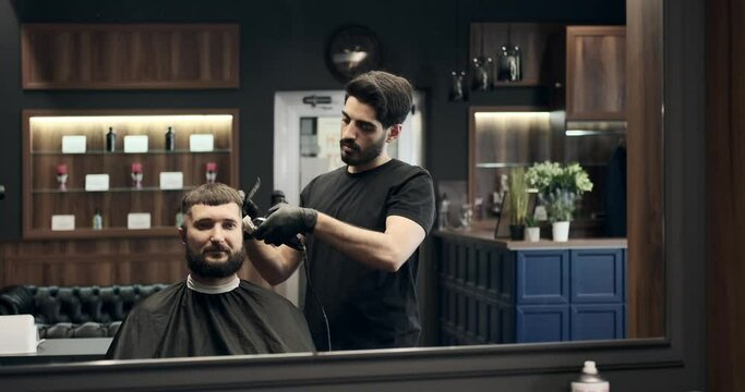 Barber cutting hair using trimmer at salon