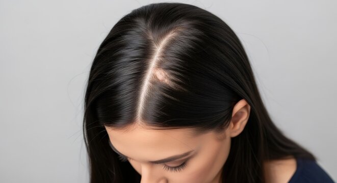 Woman with a bald spot showing hair loss and alopecia. Close-up on scalp with thinning hair. Dermatology and trichology medical concept
