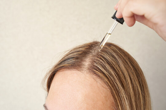 Caucasian female applying hair serum with dropper for scalp care treatment and hair health improvement.