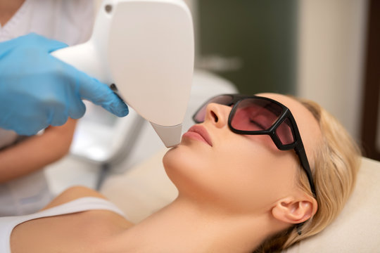Satisfied caucasian young woman lies on the couch with protective glasses during the procedure for removing unwanted hair with a laser machine. Beauty procedure. Hair removal by laser hair removal