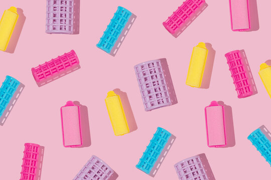 Hair rollers or curlers creative pattern on pastel pink background. Colorful layout. Fun idea for salons.