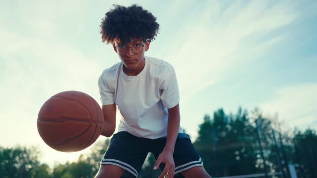 Cute teen boy with curly hair and glasses playing streetball, portrait. Teenager boy training outdoors in summer, future basketballer or streetballer, move to win in championship, hobby and sport