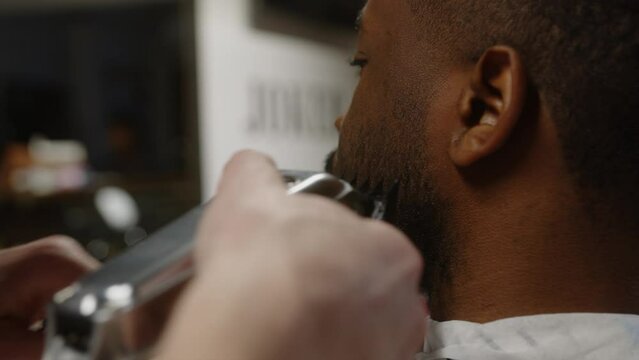 Fashionable dark-skinned guy gets a beautiful beard hairstyle in a barbershop