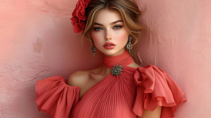 A woman with flowing hair showcased in natural light. The elegance of her movement captures a moment of beauty and grace. This is a celebration of style and femininity. Generative AI