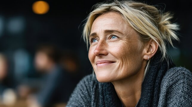 Woman's joyful face, blonde hair tied back, smiling lightly