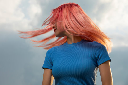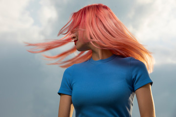 Woman toss her pink hair over sky background, creative art portrait