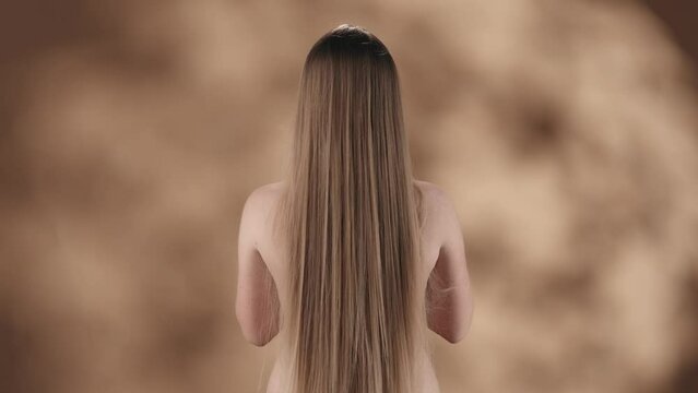 Beautiful long Hair Funny smiling woman, man with luxurious straight hair turn back around look at camera Guy showing two fingers Victory gesture Hairstyle cure extensions slow motion hair care Beauty