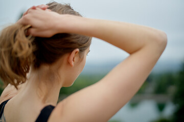 Rear view of a woman tying her hair up with a blurred natural backdrop.
