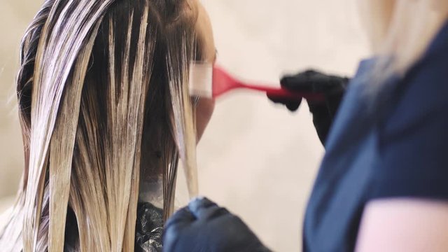 Stylist hairdresser makes hair coloring, blonding. She uses the brush. Close view. Hairdresser's hands in black gloves. Barbershop, hairdressing salon.