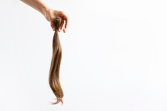 Hand holding long blond hair donation tightened with ribbon ponio for cancer patient on white background. Natural material for making wig. Horizontal with copy space.