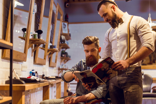 Portrait of handsome bearded man with fashionable hairstyle and beard at barber shop. He chooses a haircut in the journal.
