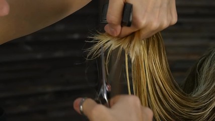 Female hairdresser hold in hand between fingers lock of hair. Trim the tips of the hair by scissors