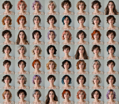 Collage of photos of women with different haircuts and hair colors, style selection concept. Generative AI