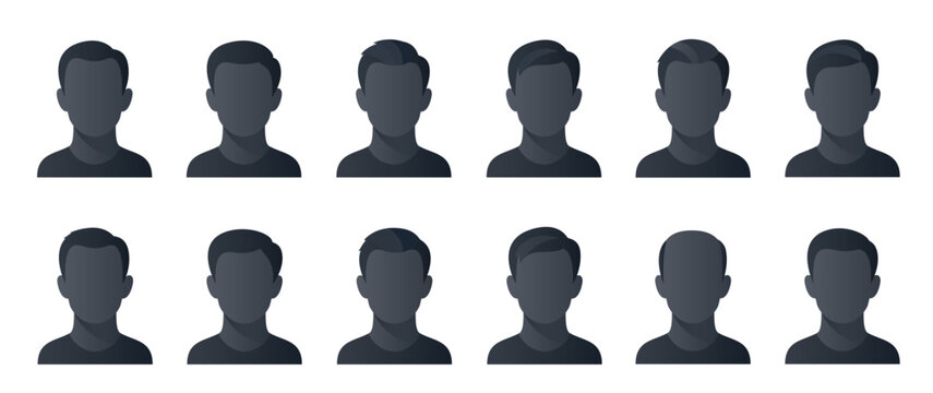 Collection of twelve different male hair styles in silhouette, showcasing various modern and classic cuts for men, isolated on white background vector illustration