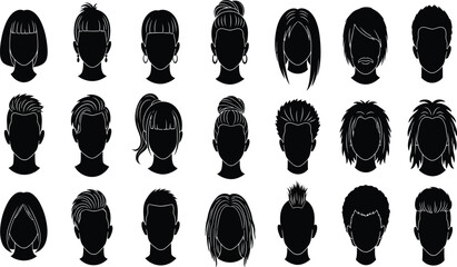 Hairstyle silhouette icons set, diverse male and female haircuts and updos, black vector avatar heads for salon, fashion, and profile designs.
