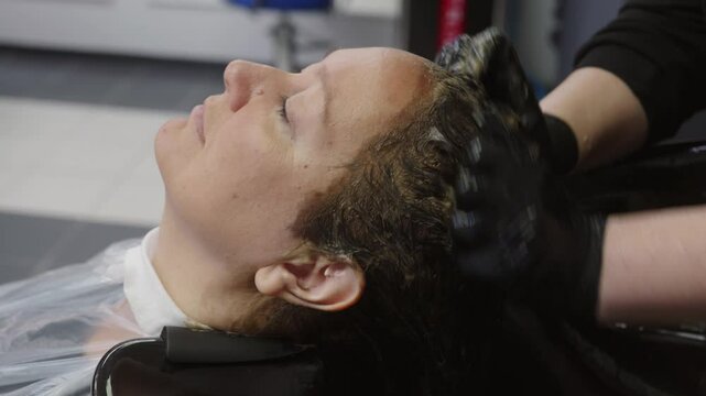 Woman enjoys a relaxing hair washing experience at a salon. The stylist uses professional techniques to ensure a soothing and rejuvenating treatment. Enhancing the client's comfort and satisfaction