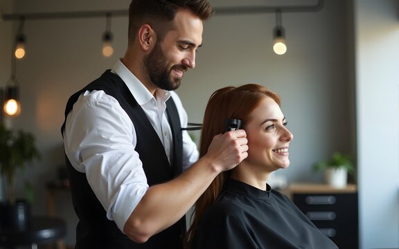 A professional barber skillfully executes a traditional men's haircut, using meticulous tools and techniques for a precise, clean look, showcasing his artistry and mastery.