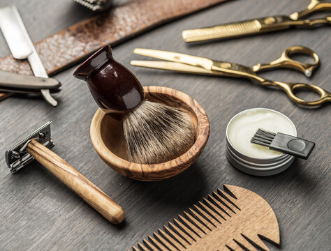 Hairdresser tools on wooden table with blurred beauty salon background. Generative AI
