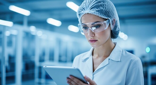 Female scientist in protective gear using a digital tablet in a modern factory. Professional worker conducting quality control in a sterile laboratory or manufacturing facility