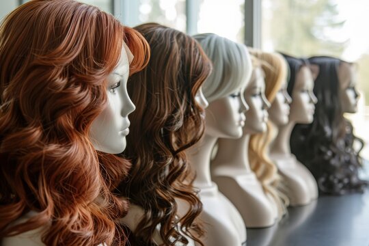 A display of various wigs neatly lined up on a table, showcasing different styles and colors, A row of hair mannequins displaying various styled wigs, AI Generated