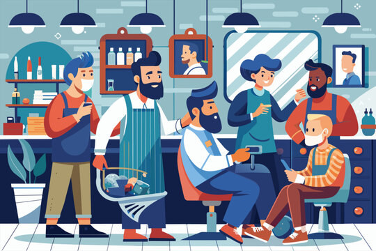 Various customers of different ages and backgrounds getting haircuts and grooming services inside a bustling barber shop, Barbershop full of clients Customizable Disproportionate Illustration
