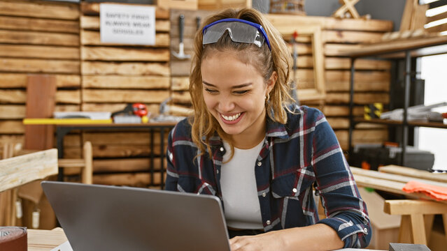Gorgeous young hispanic woman carpenter utilizing laptop for online woodworking business in her cozy carpentry workshop, safeguarded by security glasses