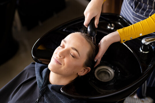 Beautiful young woman getting her haircut by a hairstylist at a beauty salon.