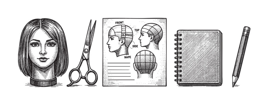 An artistic illustration of a female mannequin head, scissors, a hair sectioning diagram, a notebook, and a pencil, representing hairstyling education and tools.