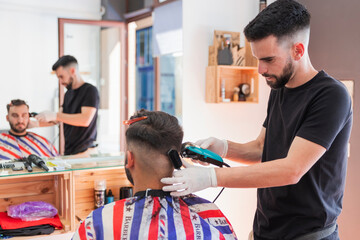 Male hairstylist cutting hair of customer with machine in salon