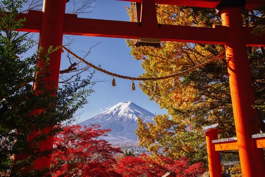 beautiful autumn scene of mountain Fuji, Lake Ashinoko and red Torii gate, Hakone, Japan