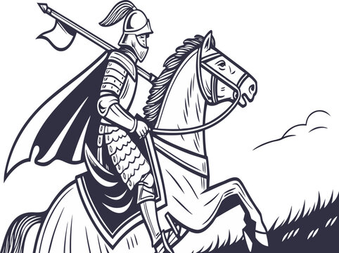 Medieval knight in full armor riding a horse holding a halberd with a cape flowing behind, dynamic action pose