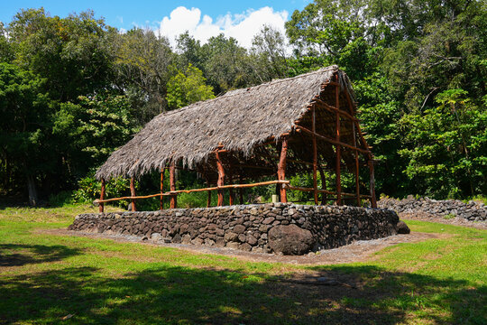 Wooden traditional hawaiian house at the Pipiwai Trailhead in the Haleakala National Park on the road to Hana, east of Maui island, Hawaii, United States