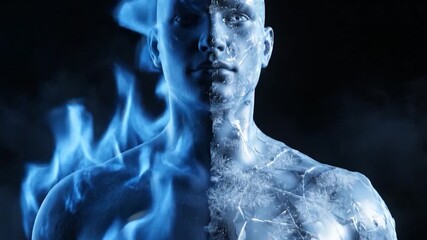 Meditative man sitting by a forest stream with half of his body digitally dissolving into blue energy particles. The image conveys a sense of transformation, mindfulness, and the connection between th