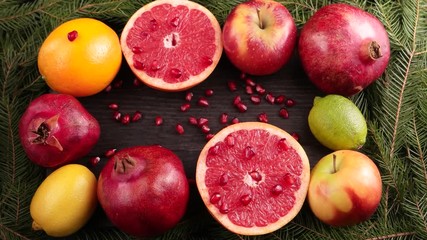 Still life with branch of pine, half grapefruit, citrus fruits, apples and pomegranate on the brown wooden board