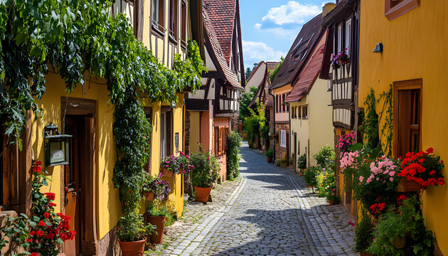 Cobblestone street in charming German town with half timbered houses. Traditional architecture. Facades decorated with flowers and plants