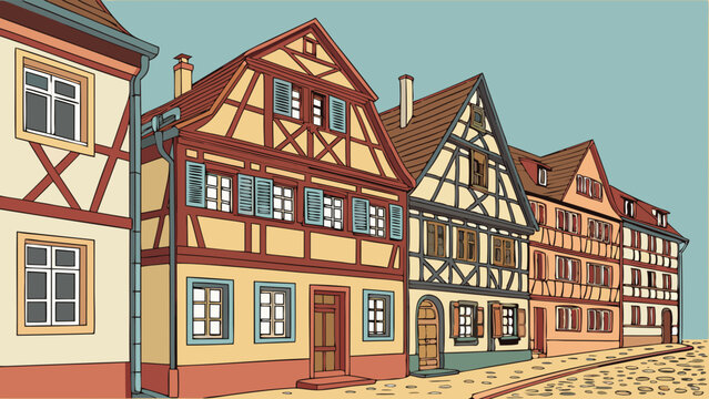 Colorful half timbered houses line charming street, showcasing unique architectural styles