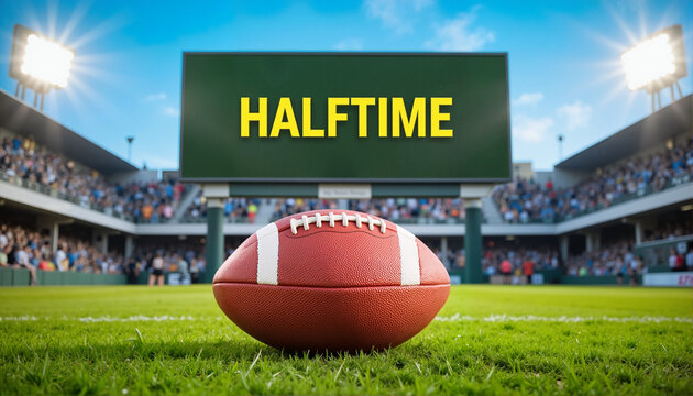 Football on grass field with halftime scoreboard, Start of the Football Season