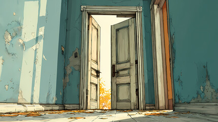 Door halfway open against blocked hallway, frame fractured diagonally across perspective. Illustration