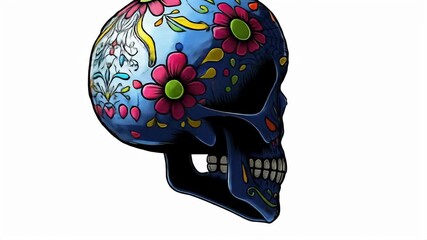 A vibrant blue skull artfully decorated with flowers and spiderwebs