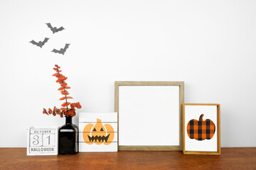 Halloween mock up. Shabby chic wood signs, calendar and orange branch decor on a wood shelf against a white wall. Copy space.
