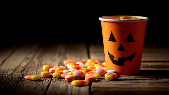 Festive orange pumpkin bucket overflowing with colorful candy corn and sweets on rustic wood halloween
